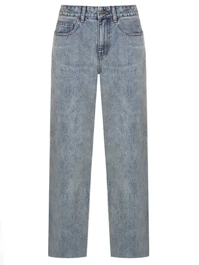 -Голубые джинсы из хлопка от JULI TOO. -Модель прямого кроя с высокой посадкой, поясом со шлевками, прорезными и накладными карманами, застежкой на молнию и пуговицу, нашивкой с логотипом бренда сзади.