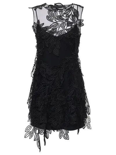 -Черное мини-платье с кружевом-макраме от ALBERTA FERRETTI. -Модель с кроем по фигуре, круглым вырезом горловины, глубоким V-образным вырезом декольте, кружевным декором и сеткой.