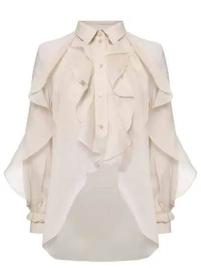-Бежевая блуза из легкого хлопка от ALBERTA FERRETTI. -Модель свободного кроя с длинными рукавами, манжетами, отложным воротником, застежкой на пуговицы, декором широкими оборками.