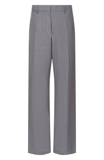 Широкие брюки с отглаженными стрелками сшили из шерстяной ткани. Модель с высокой посадкой дополнили задним и двумя боковыми карманами.