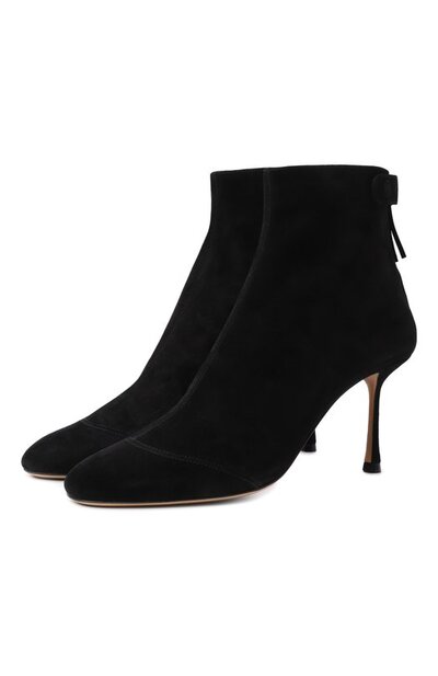 Замшевые ботильоны с внутренней отделкой из козьей кожи застегиваются короткой молнией и ремешком с кнопкой сзади. Модель с миндалевидным мысом поставили на высокую шпильку.