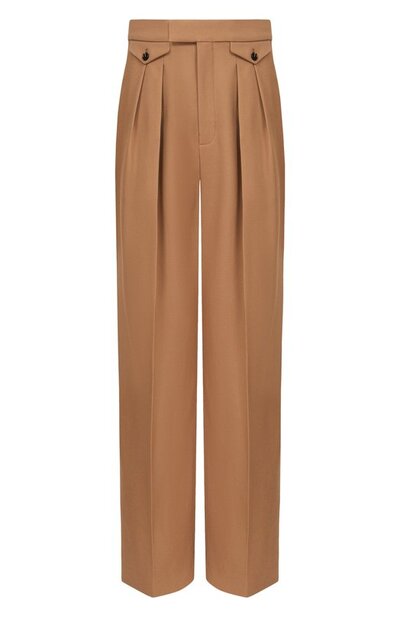 Брюки с высокой посадкой и парными складками выполнили из шерстяного габардина. Помимо боковых карманов предусмотрели и прорезные, закрывающиеся клапанами с роговыми пуговицами.