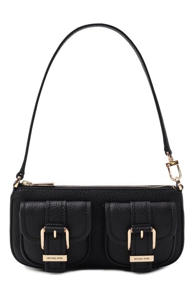 Сумку Zoe с удлиненной ручкой выполнили из шагреневой кожи. Основное отделение аксессуара закрывается молнией, а два накладных кармана спереди – кнопками на клапанах с золотистыми брендированными пряжками.