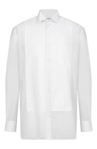 Вечерняя сорочка с манишкой, воротником «бабочка» и скошенными манжетами застегивается потайными перламутровыми пуговицами. Для изготовления модели кроя Classic fit использовали хлопковый поплин.