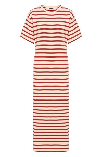 Платье со слегка спущенной линией плеч выполнили из хлопкового трикотажа в полоску. Сзади модель дополнили нашивкой с логотипом Jil Sander+.