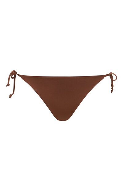 Плавки-бикини с брендированной нашивкой сзади сшили из эластичной нейлоновой микрофибры. Посадка модели регулируется завязками по бокам, одну из которых украсили подвеской в виде литеры F.
