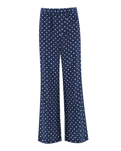 Эти шёлковые брюки — само воплощение изысканности и лёгкости. Тёмно-синий фон в сочетании с игривым белым горошком создаёт гармоничный баланс между строгостью и непринуждённой элегантностью. Модель словно создана для того, чтобы подчеркнуть индивидуальность и вкус своей обладательницы. Прямой крой дарит свободу движений, при этом изящно очерчивает силуэт. Удлинённые штанины плавно ниспадают, добавляя образу грации и утончённости. Эластичный пояс деликатно облегает талию, обеспечивая комфортную посадку без лишнего объёма — практичное решение, которое не жертвует эстетикой. Тонкая белая лампаса вдоль бокового шва вносит графическую ноту, структурируя силуэт и подчёркивая его стройность. Отсутствие карманов придаёт модели лаконичность, визуально облегчая образ. Край штанин аккуратно подшит — эта деталь придаёт брюкам завершённость и изысканность. Шёлковая ткань с благородным блеском струится, создавая завораживающую игру света. Материал отличается исключительной пластичностью: мягко облегает фигуру, не образует заломов, дарит ощущение прохлады и комфорта. Ровные, аккуратные швы без натяжки свидетельствуют о высочайшем качестве пошива — каждая деталь продумана до мелочей. Эти брюки способны стать центральным элементом как повседневного, так и вечернего образа. Они одинаково хорошо подойдут для стильной прогулки, деловой встречи или уютного ужина. Сочетание роскошной фактуры, изысканного принта и безупречного кроя делает модель незаменимой в гардеробе ценительницы истинной элегантности.