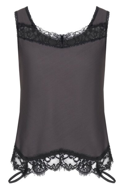 Для пошива топа прямого кроя использовали микс вискозы и хлопка. Модель с кружевной отделкой можно перевернуть и носить двумя способами: с тонкими или широкими бретелями кверху.