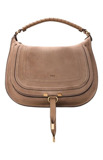 Сумку Marcie, впервые представленную в 2010 году под руководством креативного директора Ханны Макгиббон, выполнили из телячьей замши, сертифицированной по стандарту LWG. Характерный клапан, скрывающий наружный карман, дополнили шнуром из зернистой кожи, который перекликается с оплеткой ручки. Аксессуар с плоским внутренним отсеком застегивается молнией.
