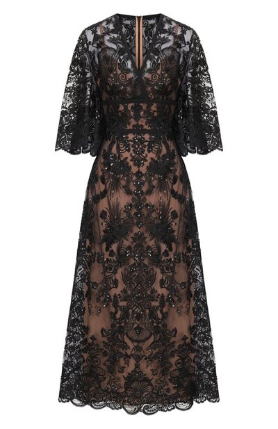Миди-платье с расклешенными рукавами и V-образным вырезом выполнили из тюля с цветочной вышивкой, подчеркнутой пайетками. Приталенная модель с бежевым подкладом на бретелях застегивается потайной молнией сзади.