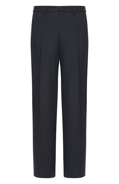 Для пошива брюк свободного кроя использовали шерстяную фланель с добавлением кашемира. Сзади модель со стрелками и четырьмя врезными карманами украсили эмблемой марки.