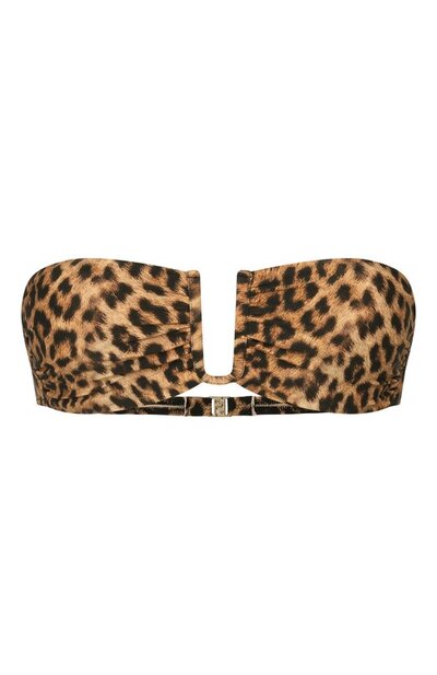 Бра-бандо с замком-защелкой сзади выполнили из эластичного быстросохнущего полиамида с леопардовым принтом. Модель со съемными вкладками в чашечках дополнили спереди золотистой U-образной перемычкой, формирующей мелкие драпировки.