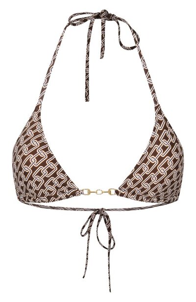 Бра Menorca с мягкими треугольными чашечками выполнили из эластичного быстросохнущего материала с принтом Chain. Модель с фактором защиты от ультрафиолета SPF 50+ дополнили двумя парами тонких завязок и золотистой пряжкой-трензелем спереди.