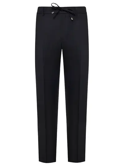 -Черные брюки из шерсти от BERWICH. -Модель прямого кроя со средней посадкой, частично эластичным поясом со шлевками и кулиской, прорезными карманами, графичными стрелками, застежкой на молнию и пуговицу. -Натуральная шерсть в составе брюк гарантирует комфортное ношение на протяжении всего дня.