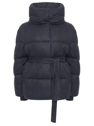 -Темно-синий стеганый пуховик из устойчивой высокотехнологичной ткани из смесового кашемира от HETREGO.