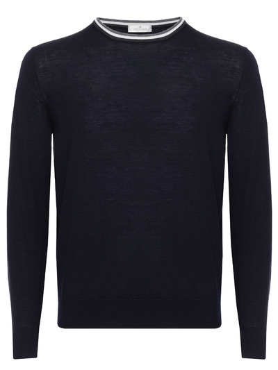 -Темно-синий джемпер из пряжи купажированного состава от PANICALE. -Модель полуприлегающего силуэта с длинными рукавами, рельефными манжетами, поясом и отделкой круглого выреза горловины с контрастной окантовкой.