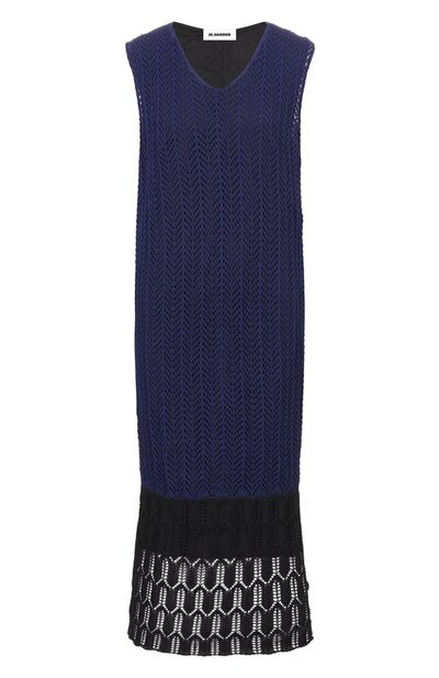Платье с двумя ажурными узорами связали в технике pointelle из хлопковой пряжи контрастных оттенков. Модель с V-образным вырезом дополнили подкладом из вискозы.