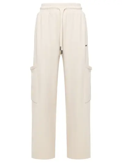 -Кремовые спортивные брюки-карго из хлопка от OFF-WHITE. -Модель свободного кроя с высокой посадкой, широким эластичным поясом на кулиске, прорезными и накладными карманами, логотипом бренда на бедре.