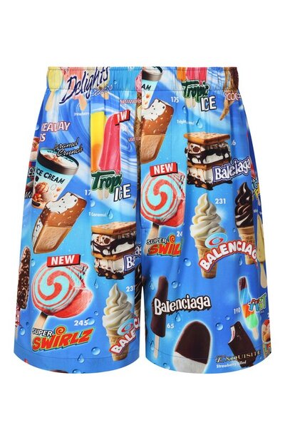 Шорты с брендированным принтом, напоминающим рекламу мороженого, выполнили из вискозы. Модель с эластичным поясом дополнили задним и боковыми карманами.
