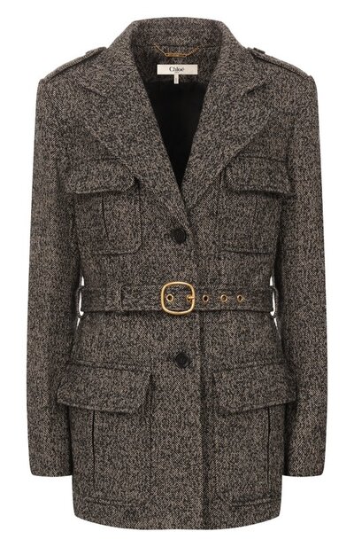 Жакет с погонами и четырьмя карманами с клапанами выполнили из смесовой шерстяной ткани с шевронным узором. Модель застегивается пуговицами из рога водяного буйвола. В комплекте – пояс с овальной пряжкой.