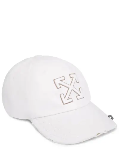 -Белая кепка из хлопка от OFF-WHITE. -Модель-шестиклинка с изогнутым прошитым козырьком, объемным вышитым логотипом спереди, регулировкой объема на затылке, декоративными потертостями и гайкой на козырьке с логотипом бренда.