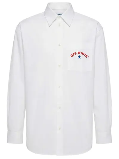 -Белая рубашка из хлопка от OFF-WHITE. -Модель прямого кроя с длинными рукавами, манжетами, отложным воротником, нагрудным накладным карманом, застежкой на пуговицы, принтом и логотипом на спине.
