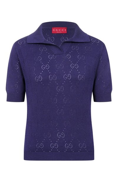 Поло из микса шелка и хлопка украсили ажурным узором GG Supreme, созданным в технике pointelle. Эластичные манжеты, пояс и планку без застежки выполнили в рубчик.