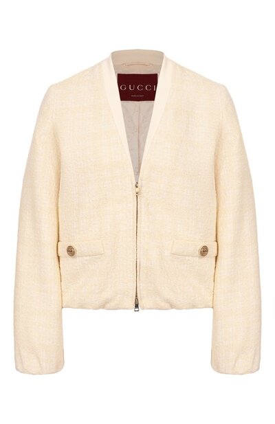 Укороченный жакет с отделкой из рифленого вискозного трикотажа вдоль глубокого V-образного выреза выполнили из фактурного клетчатого твида на основе шерсти и хлопка. Модель с эластичным поясом и боковыми карманами с декоративными брендированными пуговицами застегивается молнией.