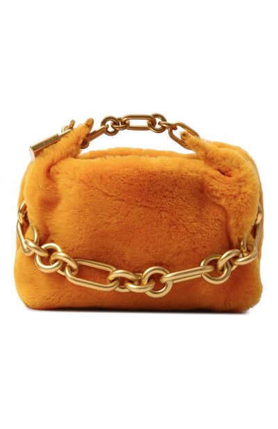 Сумку Sync из овчины меховой изнанкой наружу дополнили двумя ручками-цепочками, одну из которых декорировали брендированным навесным замком. Внутри аксессуара на молнии предусмотрели карточный слот.