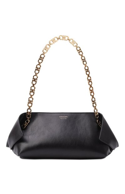 Сумку с внутренним карманом на молнии и ручками-цепочками со звеньями в виде фирменной пряжки Gancini выполнили из гладкой телячьей кожи. Модель с фольгированным логотипом спереди и заложенными в складки уголками закрывается молнией и потайными магнитами. Сбоку закрепили подвесной замок с двумя брелоками.