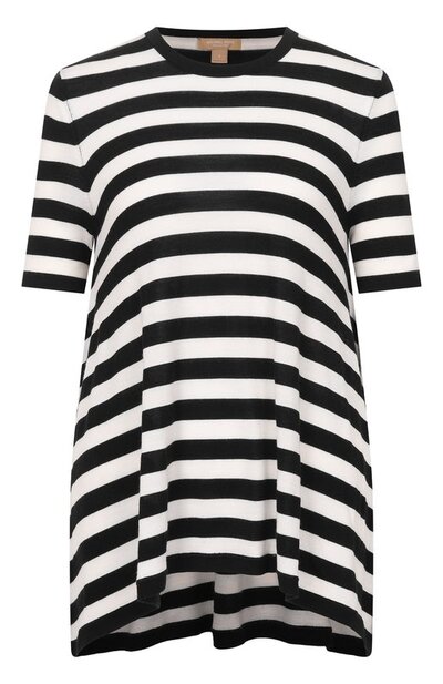 Майкл Корс включил в весенне-летнюю коллекцию свободный топ с короткими рукавами и круглым вырезом. Полосатая черно-белая модель связана из мягкой шерсти мериноса с добавлением теплого прочного кашемира. Материал содержит гладкие шелковые нити, поэтому на его поверхности не образуются катышки и нет ворсинок.