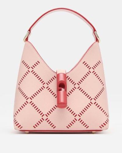 Мини-сумка-хобо из тисненой перфорированой кожи Furla Iride отличается мягким трапециевидным силуэтом. Аксессуар украшен биркой в тон с цилиндрической фурнитурой и культовым логотипом Furla Arch.