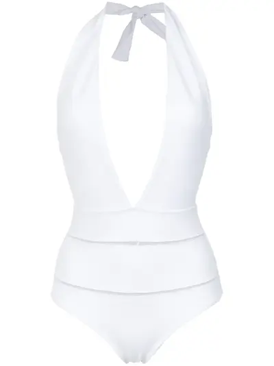 White halterneck swimsuit from Amir Slama featuring a deep V neck. Swimwear must be tried on over your own garments. This item is true to fit. Please note this item has a brazilian cut.