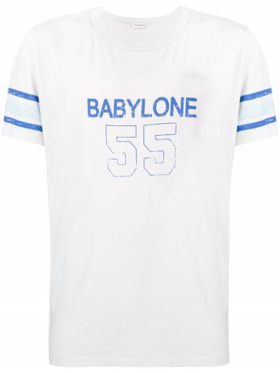 Белая с голубым хлопковая футболка 'Babylone 55' от Saint Laurent(Сен Лоран). Круглый вырез, короткие рукава, прямой подол, принт 'Babylone 55'.