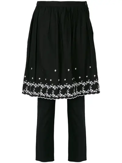 Inventors of defying silhouettes and reinvented techniques, challenging notions of beauty and aesthetics, Comme des Garçons recategorises what is called luxury fashion. Crafted in Japan from pure cotton, these skirt trousers feature a mid rise, a side button fastening, a layered flared skirt, a tapered leg, a cropped length and embroidered flowers. Please be mindful that this piece has led a previous life, and may tell its story through minor imperfection. Purchasing this item continues its narrative, so you can be confident that you’re making a POSITIVELY CONSCIOUS choice for the planet. Circa 1990.