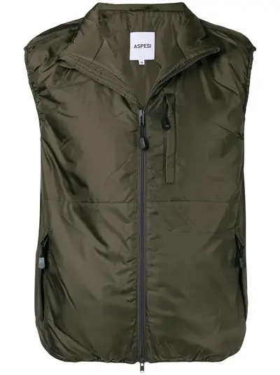 Military green padded gilet from Aspesi featuring a stand up collar, side zipped pockets and a pocket to the chest.