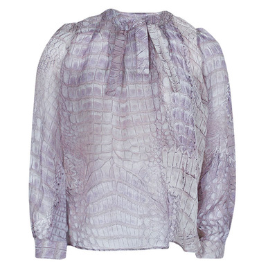 Here is a bold looking yet, charming blouse from the house of Roberto Cavalli featuring a reptile print. It has a round neck, short button placket, long sleeves with broad cuffs and a bow detail at the neck adding to its elegance.