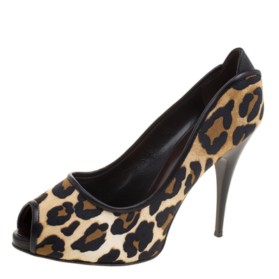 This chic pair of pumps is by Giuseppe Zanotti. Crafted from leopard print canvas, they feature a peep toe style and stiletto heels. A twist to the classic pumps this pair is a wardrobe must have.