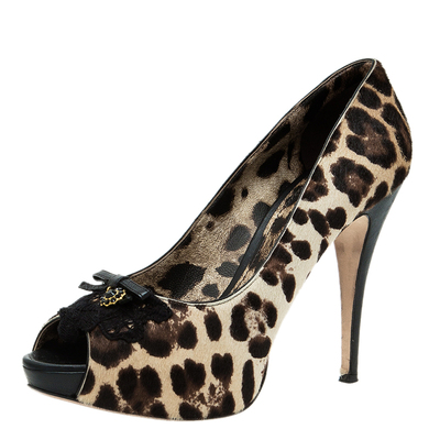 Walk with effortless style and exude elegance in these Dolce and Gabbana leopard print pumps. Crafted from leopard printed pony hair exterior, they feature rounded peep toes with bow details at the vamps and 12cm tall needle heels. The padded insoles carry the brand labels.