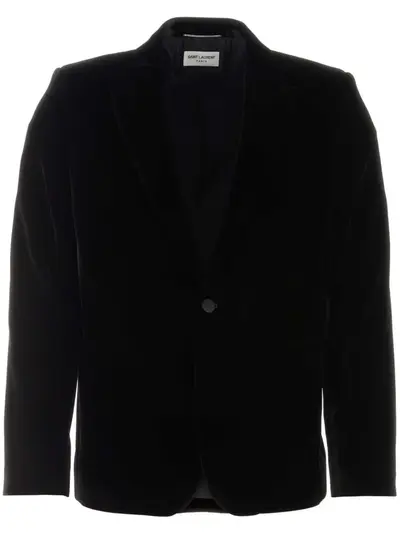 black velvet finish silk/cotton blend peak lapels front button fastening chest welt pocket two side welt pockets long sleeves buttoned cuffs English rear vents