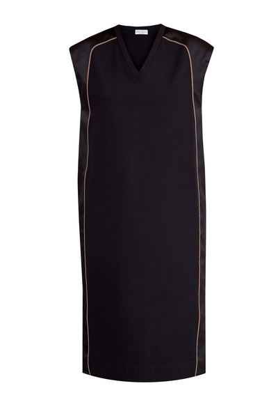 Платье прямого кроя от Brunello Cucinelli выполнено из мягкого хлопкового джерси в элегантном черном цвете. Однородные, идентичные волокна собранного вручную хлопка позволяют получить гладкую поверхность ткани. Изящный образ в стиле спортшик создают лампасы из атласа в тон с выполненной вручную отделкой из цепочек Мониль по кромкам. Изделие без рукавов дополнено лаконичным V-образным вырезом декольте. Сделано в Италии.