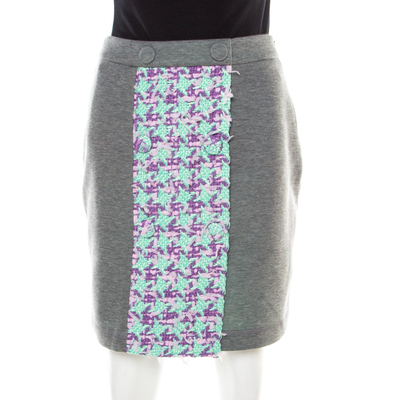 Treat yourself to this gorgeous skirt from Boutique Moschino. The skirt in grey has two button details and a tweed panel on the front. It is ideal to be worn with a tucked in T shirt and sneakers.