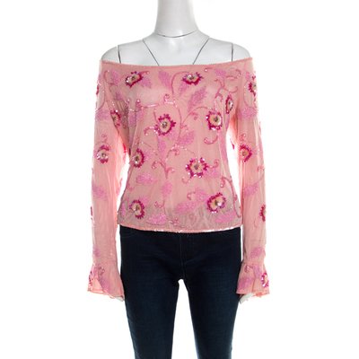 Escada offers a diverse range of the best styles and this top vouches for it. Designed in an off shoulder style, the blouse is embellished with crystals and sequins all over for a feminine appeal. The use of pink colour in this makes it an absolute match for pairing with any bottoms of your choice. Mix and match this blended fabric piece with elegant accessories to create a fashionable ensemble.
